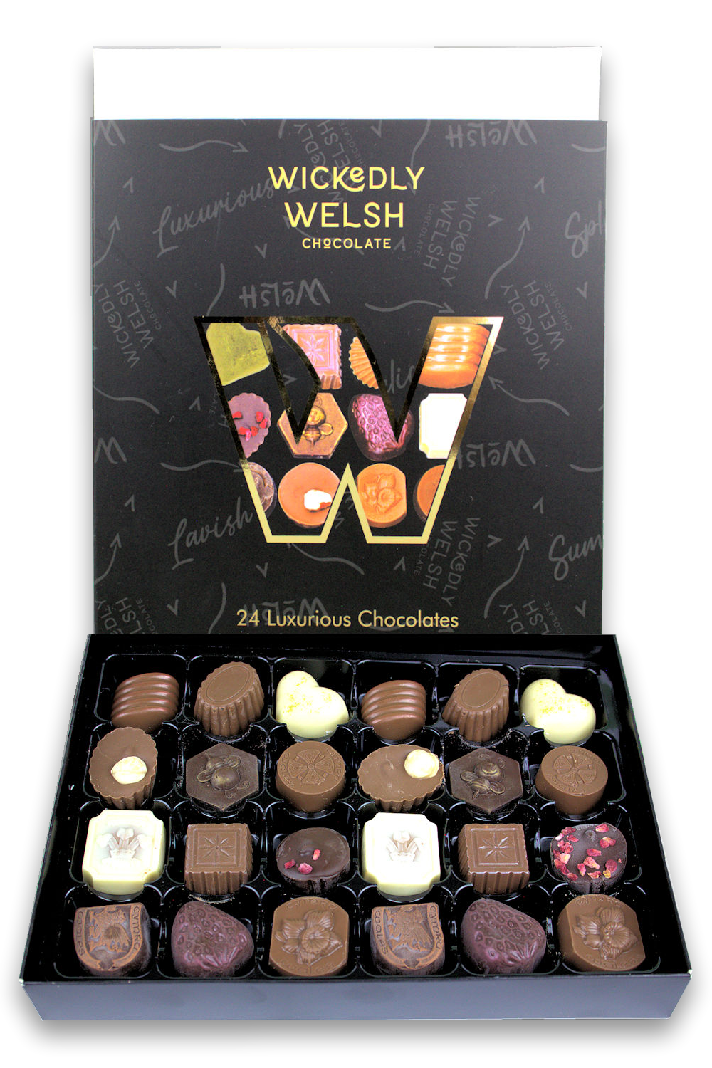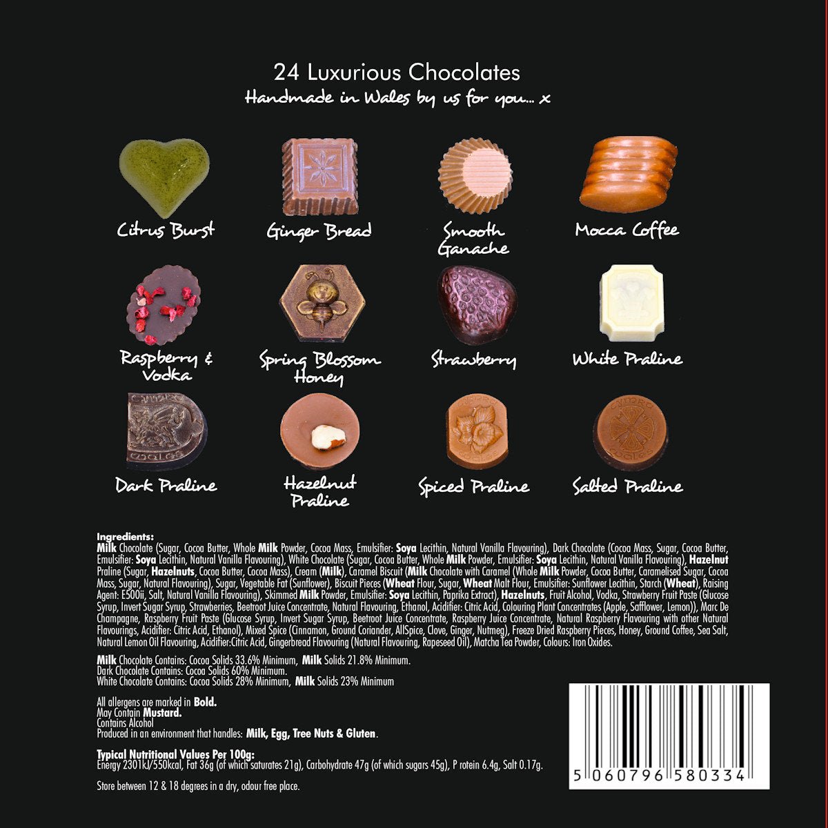 We know you can never go wrong with a good ol’ box of chocolates. but with this box you’re definitely going right. A box of twenty-four chocolates. packed full of unique and distinctive flavours – what’s not to love? Each and every chocolate is delicately handcrafted by our expert team of chocolatiers in Wales.