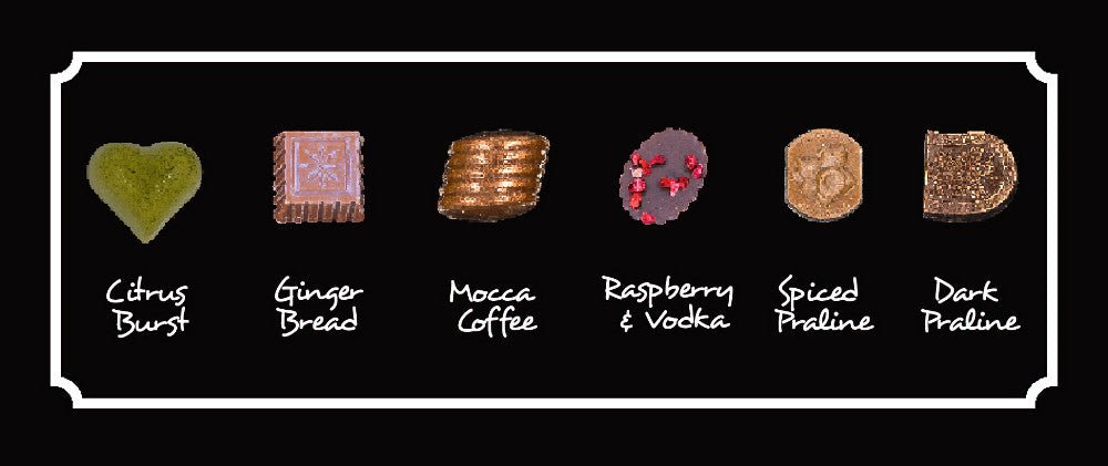 Our Ballotin of 6 is perfect to pop into a handbag. desk drawer or even as a car snack. and the delicious recipes of Citrus Burst with a pinch of Matcha Tea. Gingerbread. Mocca Coffee. Raspberry & Vodka. Spiced Praline and Dark Praline are sure never let you down.