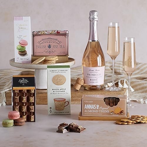 Celebration Prosecco Gift Hamper | Prosecco Gift Set -Elegant Biscuits, English Tea, Macarons & Artisan Chocolates | Gourmet Food Hamper for Mother’s Day, Birthdays, A Food Gift Men & Women Will Love