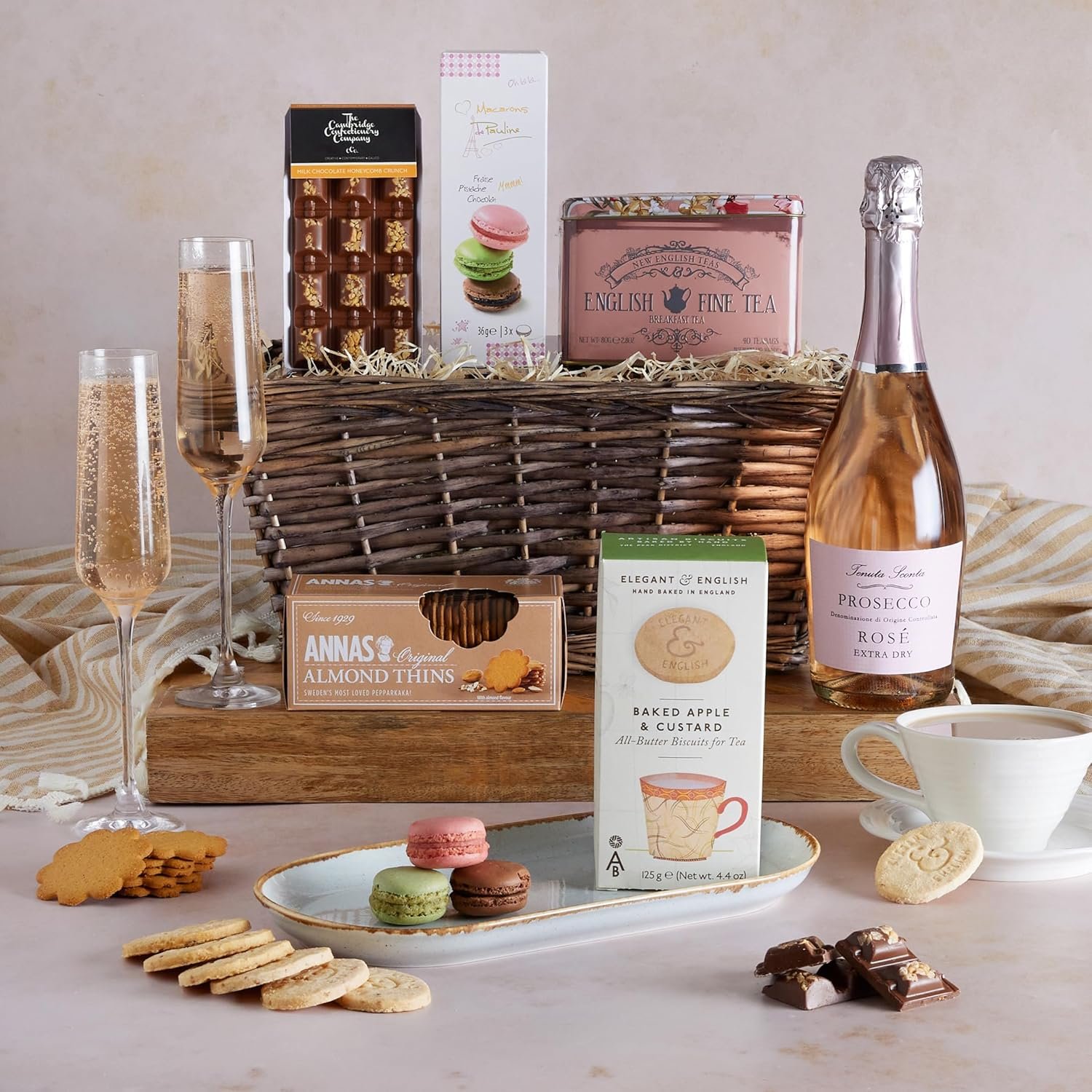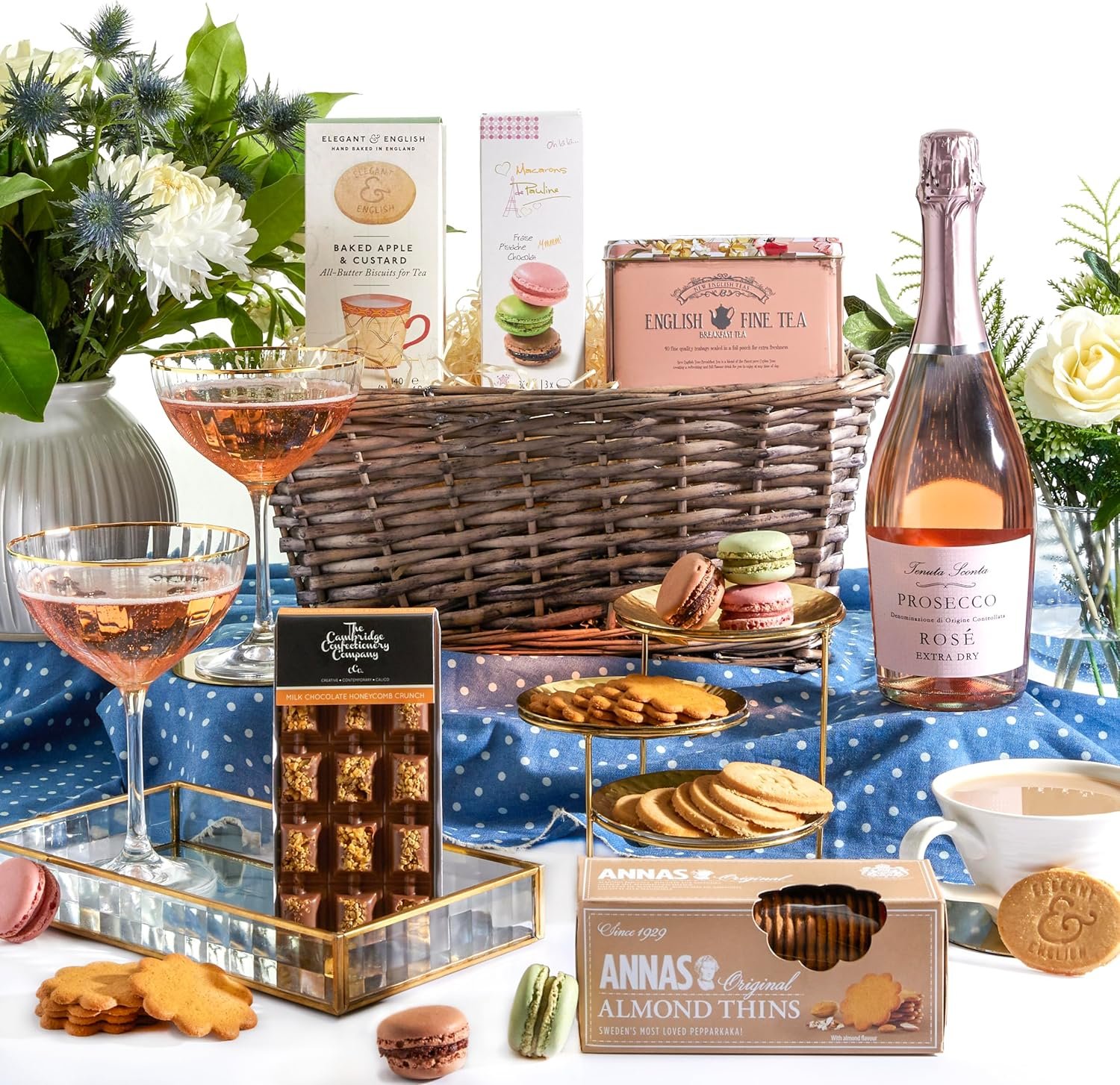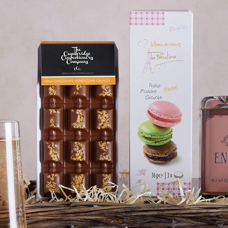 - LUXURY FOOD & DRINK HAMPER: Indulge them with a sparkling Rosé Prosecco (exclusive to Clearwater Hampers). delicate macarons. vintage tea. apple biscuits. almond thins. and chocolate honeycomb – an unforgettable treat they’ll savour. Please note – We are no longer able to dispatch orders to Northern Ireland.