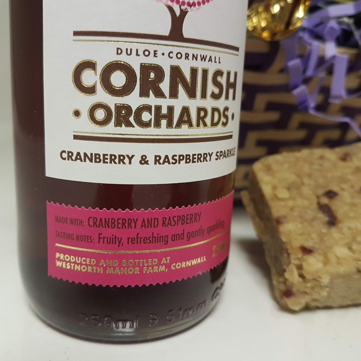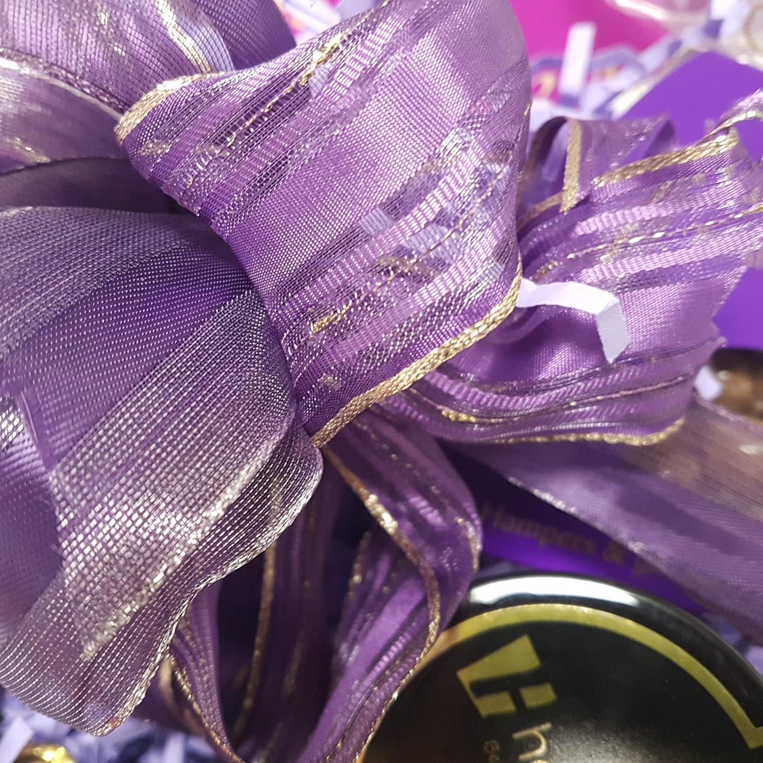 - NON-ALCOHOLIC GIFT HAMPER – Fruity and Nutty Chocolate Treats hand tied with purple ribbon and delivered anywhere in the UK.