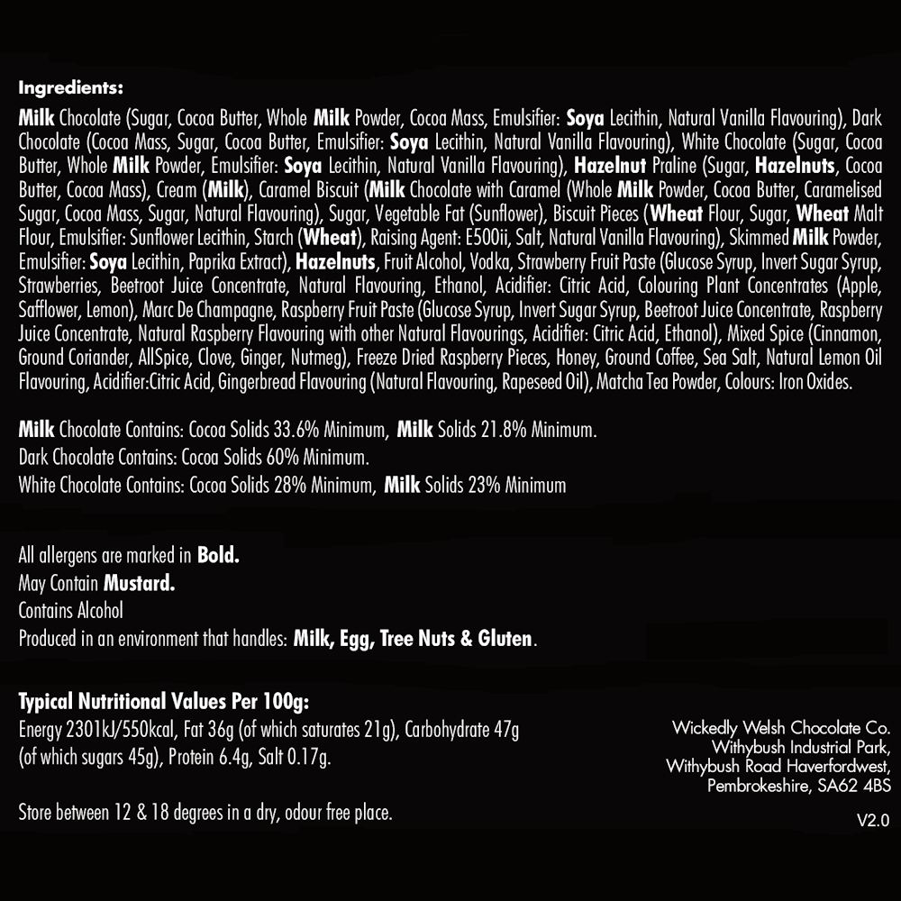 Strawberry. White Praline. Dark Praline. Hazelnut Praline. Spiced Praline. and Salted Praline—each flavour is a tribute to the art of fine chocolate-making. embodying the skill. love. and tradition that Wickedly Welsh pours into every creation.